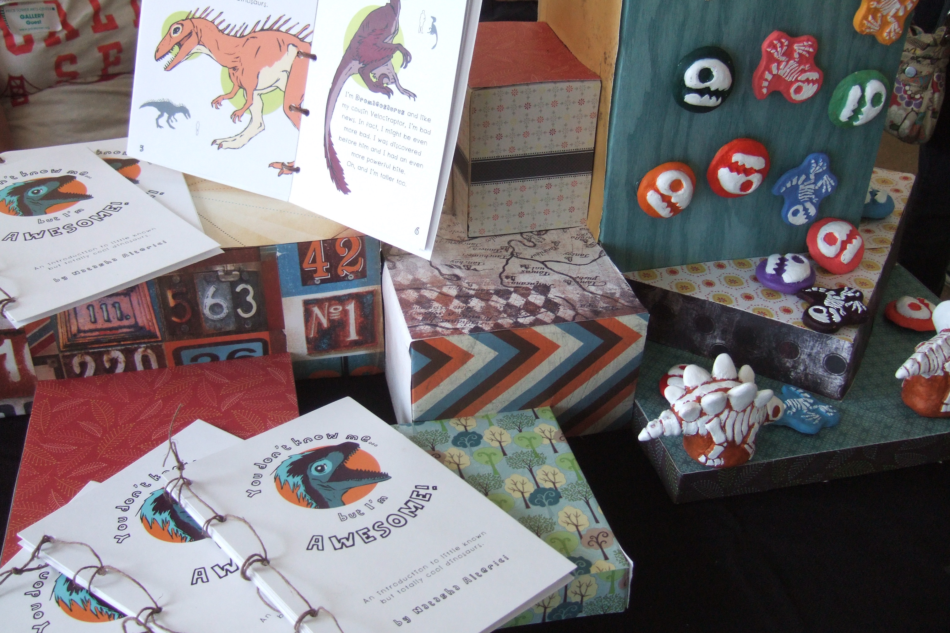 When the day of the festival arrived, she set up her colorful booth inside the art-filled tent. Her Archaeopteryx rested on an easel next to the table; books, magnets and sculptures were placed upon a cardboard city she created using shoeboxes and festive paper; and key chains hung over the city on a dowel rod “T”.